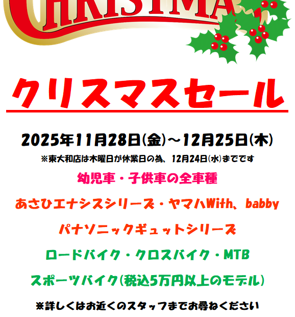 ブリーズサイクルよりクリスマスセール開催のお知らせです。 期間:2025年11月28日(金)から12月25日(木) ※東大和店は12月24日(水)まで 幼児車・子供車は全品2000円値引き。電動アシスト自転車あさひのエナ… 続きを読む »クリスマスセール開催