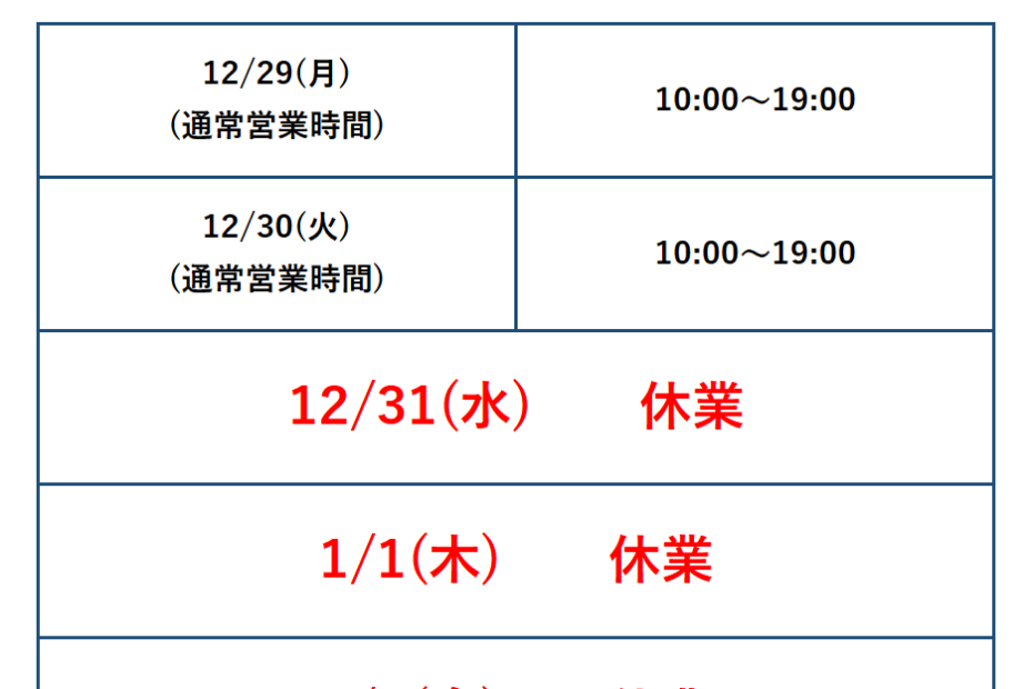 年末年始の営業時間のお知らせ
